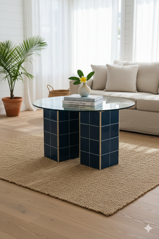 Mesa de salon redonda con base de azulejos y sobre de cristal